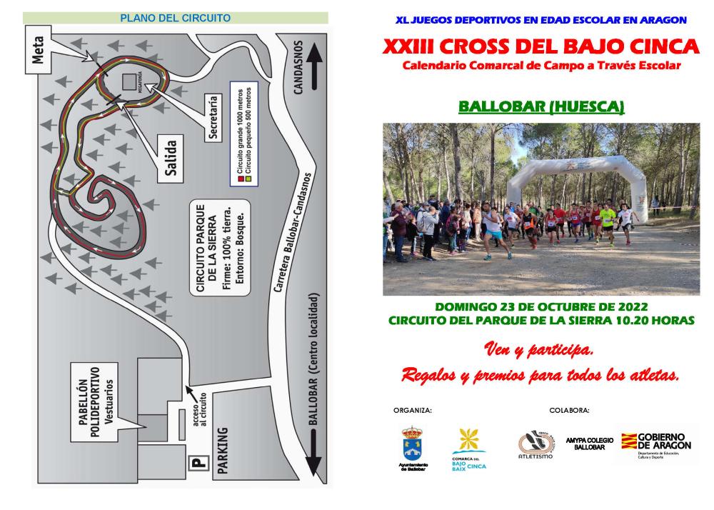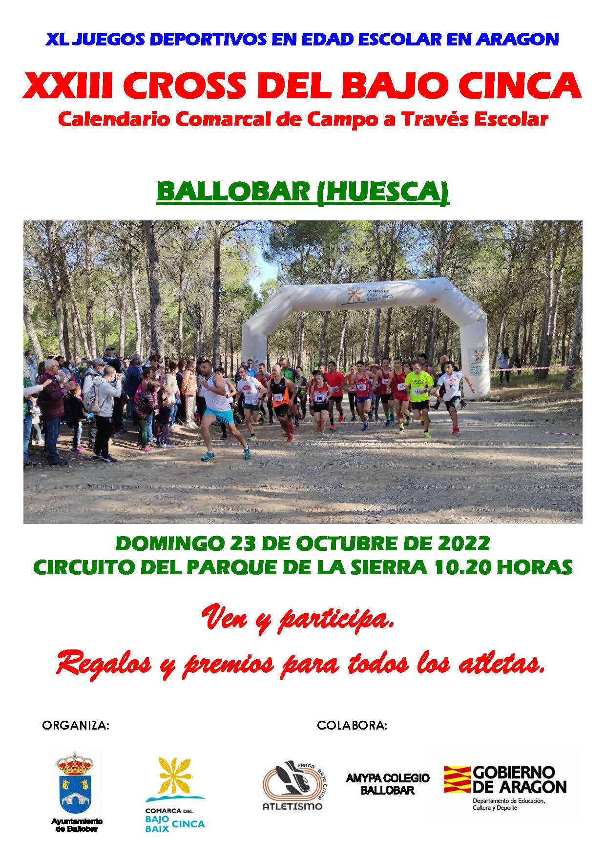 El próximo domingo 23 de octubre a partir de las 10:20 horas se celebrará el XXIII Cross de Ballobar, organizado por el Ayuntamiento de la Ballobar y la Comarca del Bajo/Baix Cinca, con la colaboración del Club Atletismo Fraga Bajo Cinca y el AMYPA de Ballobar.