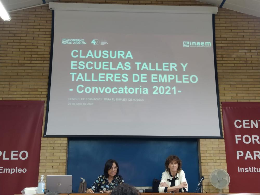 El acto contó con la participación de la directora gerente del Instituto Aragonés de Empleo, Elena Guinda, y de la directora provincial del INAEM, Carmen Lanau, los principales protagonistas, que eran los alumnos trabajadores, los equipos docentes y directivos y representantes de las Instituciones promotoras de otros 6 talleres de empleo/escuelas taller de Comarcas y Ayuntamientos de la provincia de Huesca.