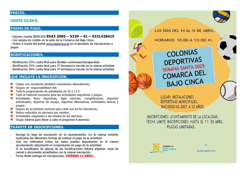 El Área de Deportes de la Comarca del Bajo/Baix Cinca ha puesto en marcha una nueva edición de las Colonias Deportivas de Semana Santa, que se celebrarán los días 14, 15 y 16 de abril en los municipios de la comarca. La iniciativa está dirigida a niños y niñas nacidos desde 2021 hasta los 12 años, con el objetivo de fomentar la práctica deportiva y la convivencia durante las vacaciones escolares.