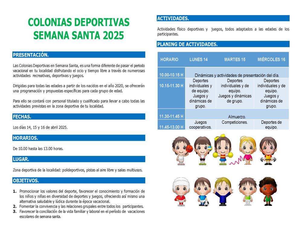 Las colonias tendrán lugar en las instalaciones deportivas municipales de cada localidad, en horario de 10:00 a 13:00 horas. Están diseñadas para ofrecer una alternativa de ocio saludable a través de juegos y actividades físicas adaptadas a la edad de los participantes, bajo la supervisión de monitores titulados.