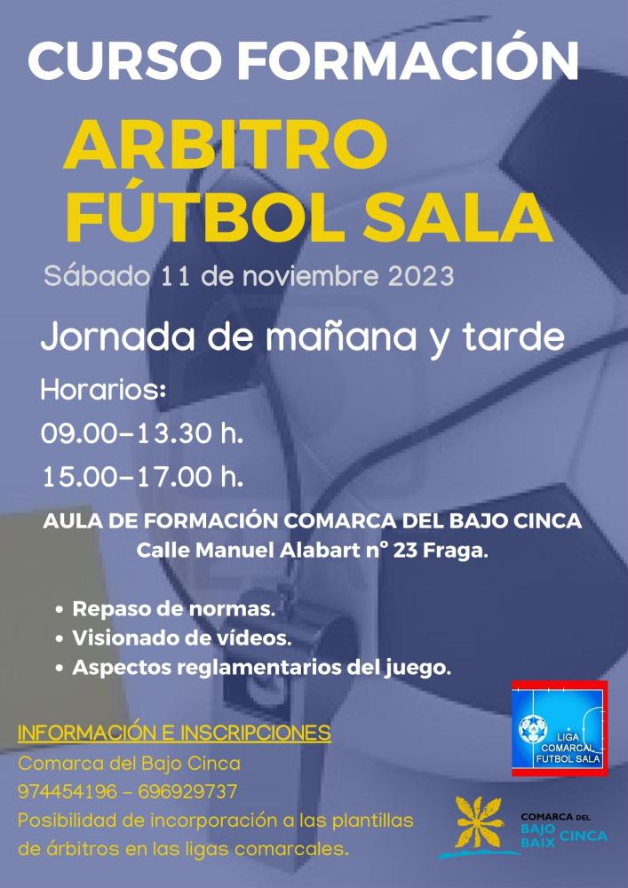 El sábado 11 de noviembre se llevará a cabo, en sesiones de mañana y tarde y de forma intensiva, el curso de formación de árbitros de fútbol sala que la Comarca del Bajo/Baix Cinca organiza en colaboración con la Liga Comarcal de Fútbol Sala adultos.