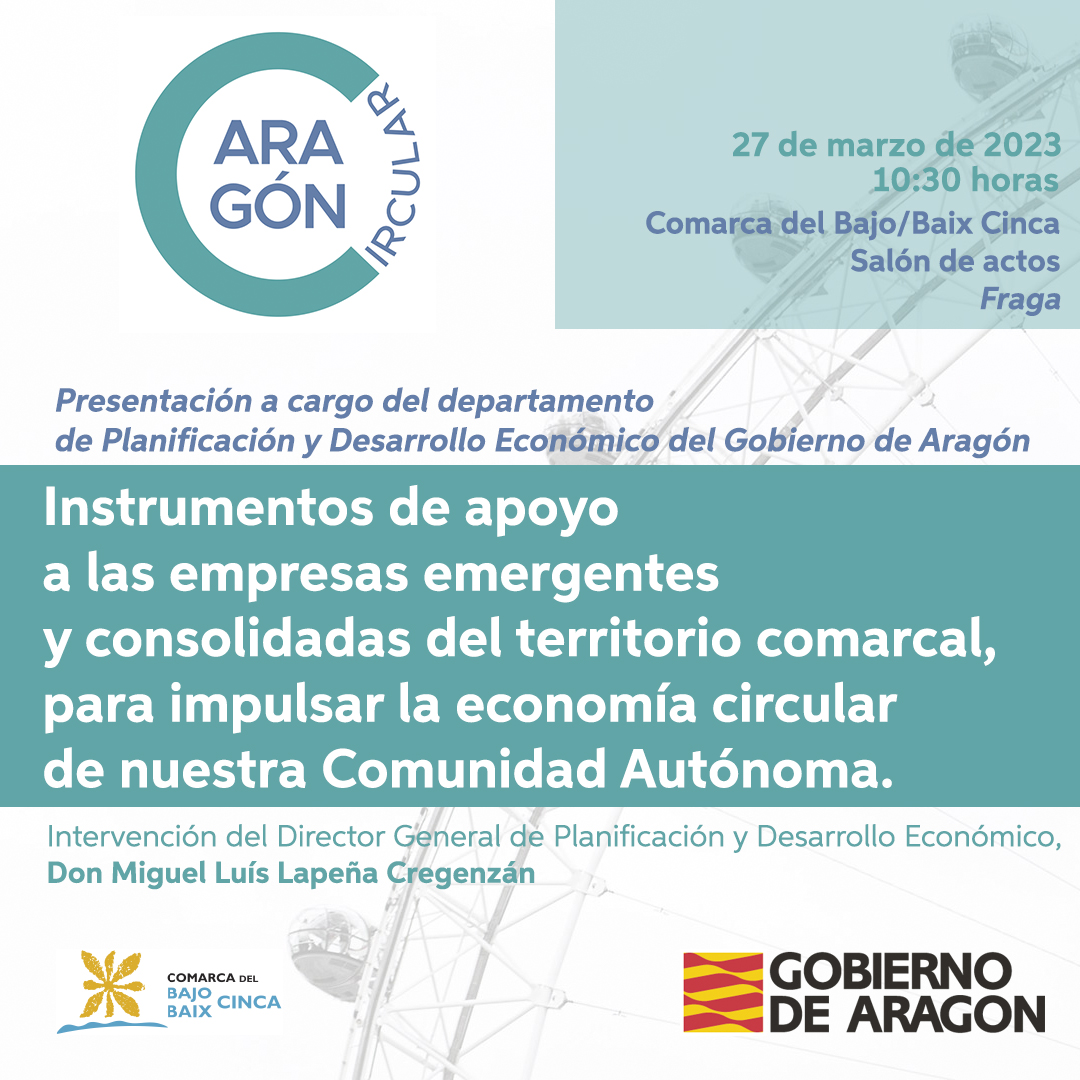 Posteriormente, a las 10:30 horas, en el salón de actos de la sede comarcal, se va a llevar a cabo la presentación “Instrumentos de apoyo a las empresas emergentes y consolidadas del territorio comarcal, para impulsar la economía circular de nuestra comunidad autónoma (Aragón circular y Sello de Aragón Circular)”, a cargo del departamento de Planificación y Desarrollo Económico del Gobierno de Aragón, acto en el que intervendrá y será cerrado por Miguel Luís Lapeña.