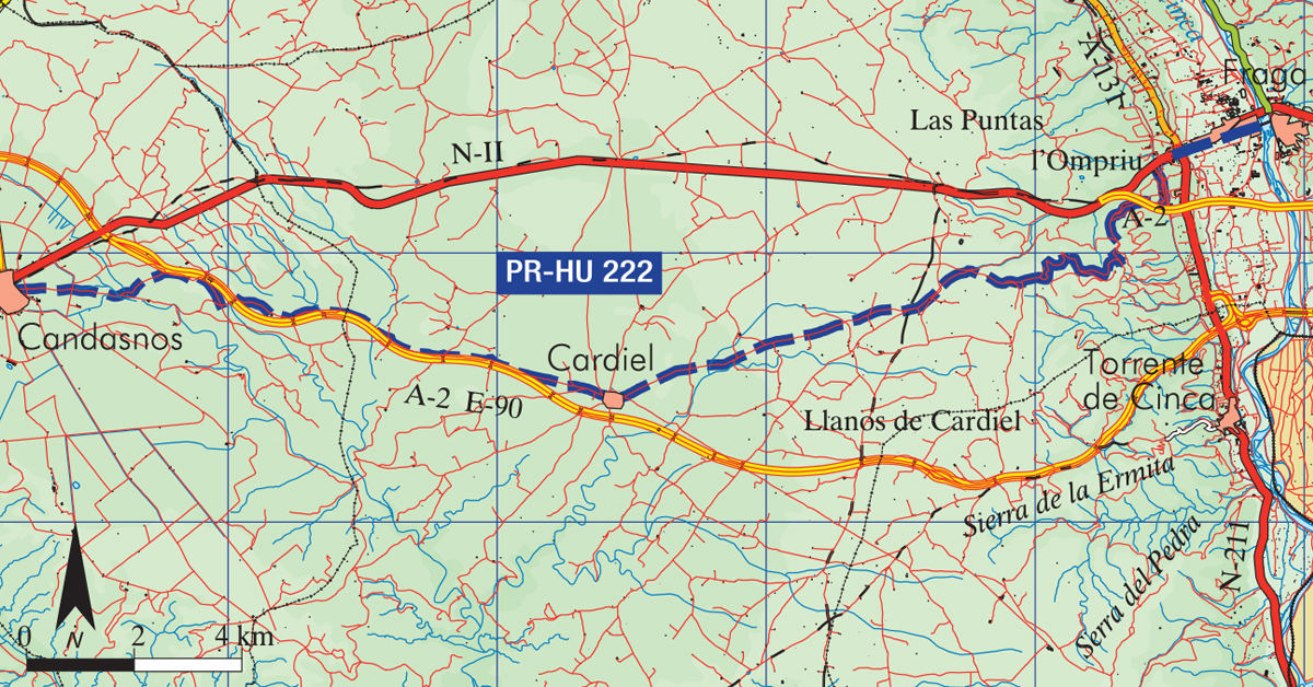 La ruta marcada como PR-HU 222 va de Fraga a Candasnos tiene una distancia de 21 km. De dificultad media-baja es apta para hacerla tanto en BTT como andando.